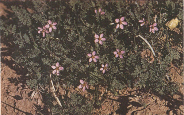 This beautiful, dwarfed plant, never more than an inch or two high, is found during May mostly on the lava fields of the Transition Zone in Zion National Park. Its flower of white petals with pink veins is about 2 inches in diameter.