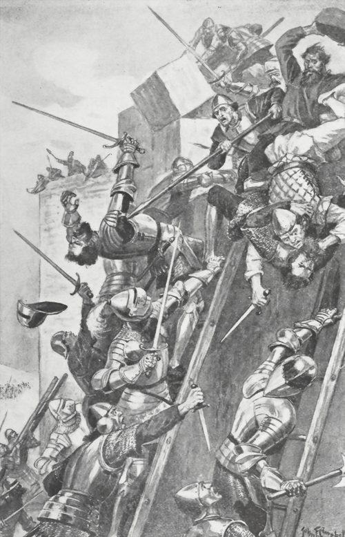 Under his left arm he bore a flag, its folds gathered closely to his side, as if he feared to injure the cherished fabric by contact with the rough stone walls of the staircase; for the flag he had charge of was the banner of the renowned knight, Sir Oliver Lysle, of the Castle of Warblington, in the county of Southampton, and of the Château of Taillemartel, in the Duchy of Normandy.