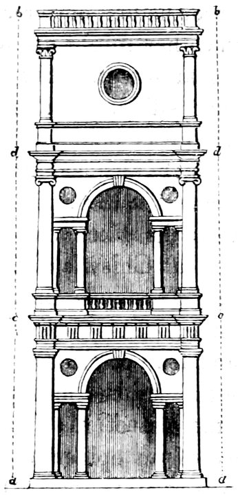 Considering the particular arrangements and present mixed style of this noted Basilica to have been peremptorily insisted on by the public, we can then concede to Palladio the merit of an honourable conquest over difficulties. The adjoined wood-cut represents in simple outline 174one of the seven bays or compartments, which form the longitudinal elevation of the main building. The relative situations of the perpendiculars a to b, as well as their height, were unalterable. The heights a to c, and c to d, were also fixed. If, therefore, simple arches had been adopted, affording the required superficies of aperture, their limited height must have borne a very disproportioned ratio to their extended breadth. If columns had been employed alone, the great width of the interspaces would have been offensively opposed to the laws which govern that department of architectural design. The application, therefore, of the smaller columns is here most admirable. By this measure, a central arch of good proportions is obtained, and a sufficient supply of light is secured to the interior by the lateral openings under the imposts, and by the circular apertures above them.