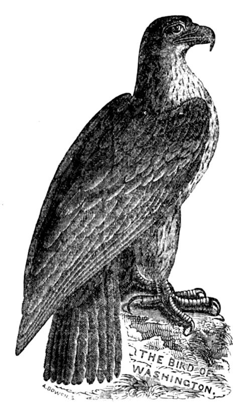 For a long time this bird was almost unknown; and though specimens of it appear to have been examined even by scientific men, its identity as a distinct species remained hidden until the year 1814. In February of that year Mr. Audubon, while voyaging up the Mississippi, noticed here and there a solitary bird, soaring above the rocky cliffs, entirely different, as it appeared to him, from any species with which he was acquainted. After much search he discovered an eyry on the high cliffs of Green River, in Kentucky, and was enabled to make such observations as convinced him that this was a new, and hitherto unknown, species of Eagle. From its noble bearing and majestic size, he named it the Bird of Washington, a title by which it is now generally recognized. Some, however, confound it with the White-tailed Eagle, and others affirm that it is but a full grown Sea Eagle. With better reason it is supposed to be either identical with the great European Sea Eagle of Brisson, or but a variety of that bird. Audubon considers the species as rare. His principal residence is among the rocky shores of the Mississippi, the Missouri, and the great northern lakes—in those gloomy solitudes rarely disturbed by the step of man. Winter drives it from these favorite haunts nearer to the abode of civilization; and in a severe season the Washington Eagle has been seen in the vicinity of Concord and Boston. His principal food is fish; but instead of obtaining it in the same piratical manner as is common with the Bald Eagle, he descends, like the Osprey, into the same element with his prey. The circles which he describes in flying are wider than those of the White-headed Eagle, and when about to dive for prey, he sweeps downward in spiral rings, as though endeavoring to prevent the fish’s escape. When within the distance of a few yards, he darts forcibly down, and rarely fails to secure his object. He is also remarkable for flying near the surface of the water, especially when retiring with his prize; and when near the shore he may often be recognized by the same peculiarity.