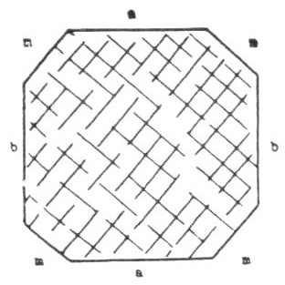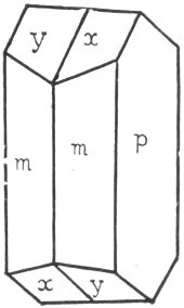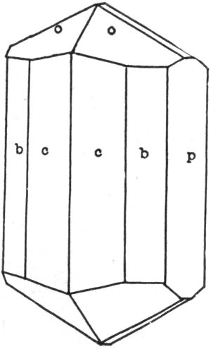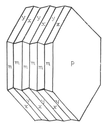 Lastly there is a group of crystals which have four axes, one vertical, and three in the horizontal plane which intersect each other at angles of 60°, all these three being equal to each other, but different from the vertical axis. The simplest form in this system is the six-sided prism. If one corner of this prism is cut all must be, and if these corner faces are extended to meet each other, a double-six-sided pyramid results. In this system if one of the vertical edges of the prism is beveled, all must be, but the horizontal edges need not be; or the horizontal edges may be beveled and the vertical ones not. The ends as they are related to the c axis may be 19 developed independently of the prism, and so the prism may be simply truncated by a flat end, or have pyramids on either end.