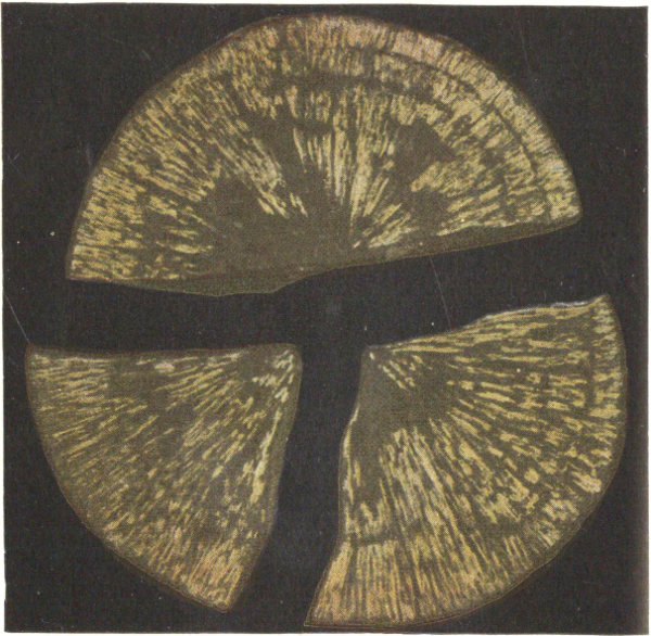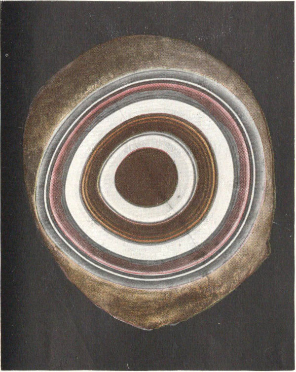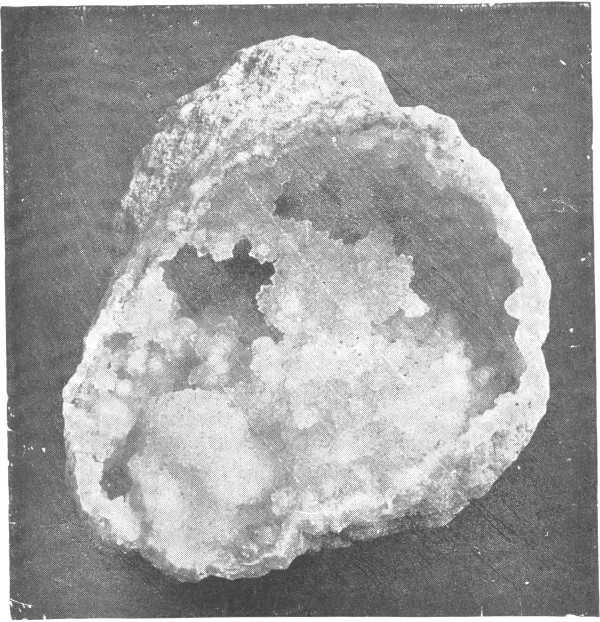 Crystals are formed in liquids as they cool or evaporate and can no longer hold the minerals in solution. Crystals start about a center or nucleus, and molecule by molecule, the orderly arrangement is increased and the crystal grows, there being no size which is characteristic. If free in the liquid the crystal grows perfectly on all sides, but if crystals are growing side by side, there comes a time when they interfere with each other. Then the free faces continue to grow and the orderly 15 internal arrangement is maintained, though externally there is interference.