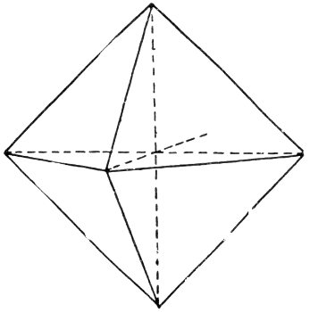 When the axes are all equal and at right angles to each other, a crystal is said to be in the isometric system. The cube is the basal form and each side is known as a face. The ends of the axes come to the middle of the cube faces. The essential feature of this system is that whatever happens to one axis must happen to all, which is another way of saying that all 14 the axes are equal. If we think of the cube as having the corners cut off, we would have a new face on each of the eight corners, in addition to the six cube faces. Then if each of these new faces were enlarged until they met and obliterated the cube faces, an eight-sided figure, the octahedron, would result. In this the axes would ran to the corners. Another modification of the cube would be to bevel each of its twelve edges, making twelve new faces in addition to the six cube faces. If we think of these new faces being developed until they meet and obliterate the cube faces, there will result a twelve-sided figure, the dodecahedron. And the 24 edges of the dodecahedron could be beveled to make a 24-sided figure, and so on. Of course in Nature the corners are not cut, nor the edges beveled, but as a result of the interaction of the forces expressed by the axes and the distribution of the molecules, the molecules arrange themselves in a cube, octahedron, dodecahedron or combination of these basal forms.