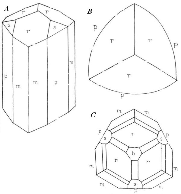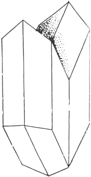 In this system it is quite common to have forms which result from the development of each alternate face of either the prism or the double pyramid. In the case of the prism, if every alternate face is developed (and the others omitted) a three-sided prism results, as in tourmaline. In the case of the double pyramid if the three alternate faces above are united with the three alternate faces below, a six-sided figure is formed, which is known as the rhombohedron, as all the faces are rhombohedral in out-line and all equal. These forms in which only half the faces are developed are known as hemihedral forms. The same sort of thing may happen in the isometric system in the case of the octahedron, and also in the case of the octahedron of other systems. When half the faces of the octahedron are developed, two above unite with two below and make a four-sided figure, known as a tetrahedron. (See plate 10.) While tetrahedrons may occur in any of the first five systems they are not common outside the isometric system.