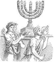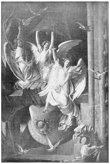 This picture explains and is symbolic of the most progressive one hundred years in history. In the center stands the beautiful female figure typifying Industry. To the right are the goddesses of Music, Electricity, Literature and Art. Navigation is noted in the anchor and chain leaning against the capstan; the Railroad, in the rails and cross-ties; Machinery, in the cog-wheels, steam governor, etc.; Labor, in the brawny smiths at the anvil; Pottery, in the ornamented vase; Architecture, in the magnificent Roman columns; Science, in the figure with quill in hand. In the back of picture are suggestions of the progress and development of our wonderful navy. Above all hovers the angel of Fame ready to crown victorious Genius and Labor with the laurel wreaths of Success.