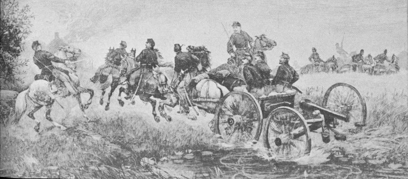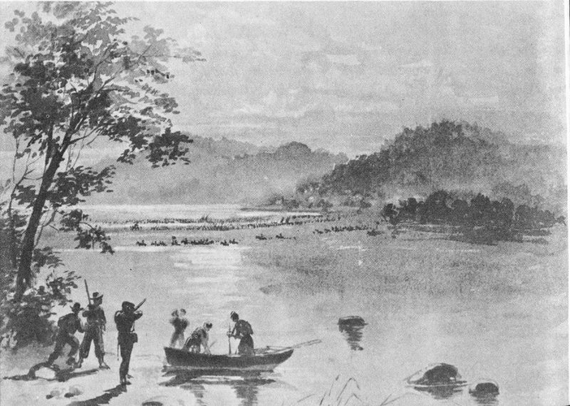 Lee’s army crossing the Potomac; Union scouts in foreground. From wartime sketch by A. R. Waud. Courtesy, Library of Congress.