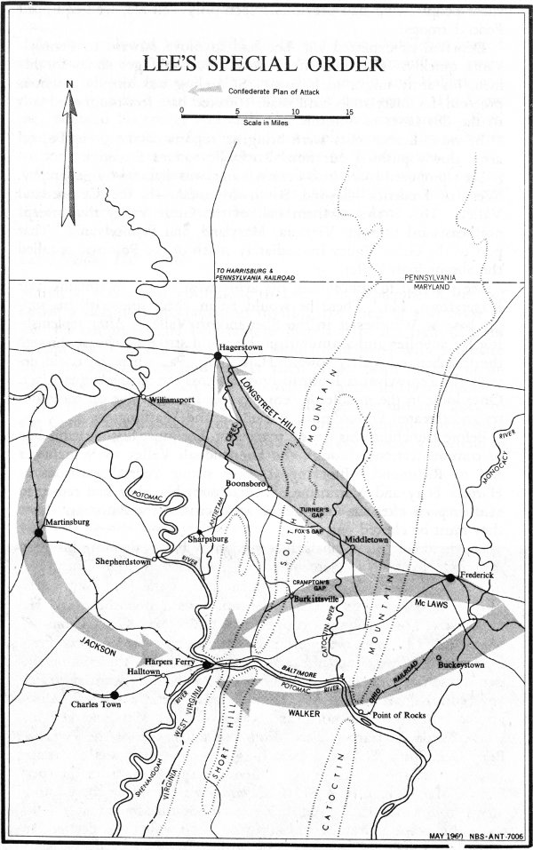 (At this point a fateful event occurred—one which was destined to change the subsequent course of the campaign. D. H. Hill, Jackson’s brother-in-law, had until this time been under Jackson’s command. Unaware that a copy of Lee’s order had already been sent to Hill, Jackson now prepared an extra copy for that officer. Hill kept the copy from Jackson; the other was to provide the script for much of the drama that followed.)