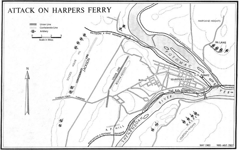 The village of Harpers Ferry lies at the gateway cut through the mountains by the Potomac and Shenandoah Rivers, whose waters join there. Situated at the apex of the triangle of land between the rivers, the town is completely dominated by Loudoun and Maryland Heights. By nightfall of September 14, McLaws and Walker had artillery on these heights ready for plunging fire into the town; Jackson had stretched his lines across the base of the triangle between the rivers.