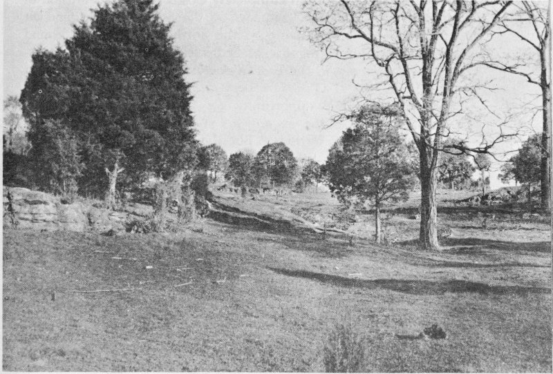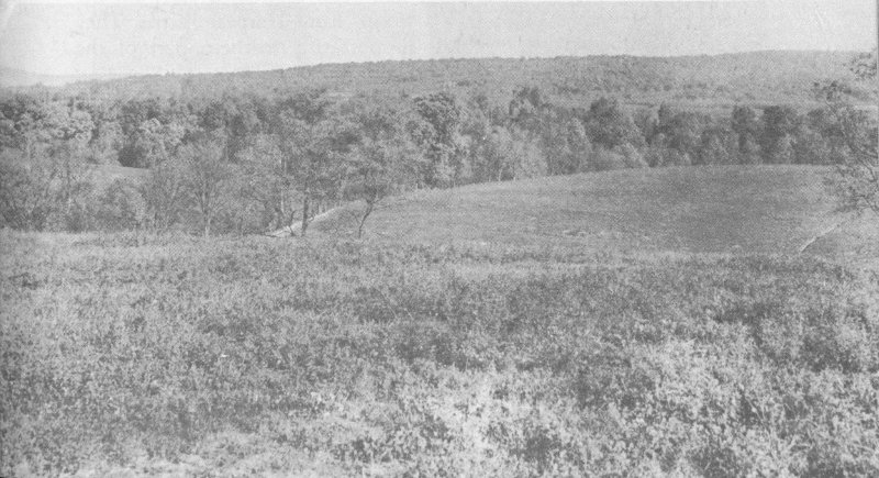 From the Hagerstown Pike, gently rolling farmland spreads a mile eastward to Antietam Creek and the same distance westward to the winding Potomac River. A mile north of Sharpsburg was a heavy patch of trees known as West Woods; it was about 300 yards wide at its southern limits, tapering to 200 yards or less as 15 it stretched away northwest from the pike. Half a mile east of Hagerstown Pike was another patch of trees called East Woods; it was 200 yards wide and extended a quarter mile south across the Smoketown Road. North Woods, a triangular plot of trees, stretched east from the Hagerstown Pike over the Poffenberger farm. Half a mile to the west looms Nicodemus Hill, a prominent landmark near the Potomac. Artillery on its heights would command the open ground lying between the patches of woodland. In this open area east of the Hagerstown Pike lay a 40-acre cornfield. West of the pike were outcroppings of rock running nearly parallel to the road—ready-made fortifications. Adjacent to the Hagerstown Pike, on a slight rise near the lower end of West Woods, stood a Dunker Church, a small white building framed by massive oaks. Southeast of Sharpsburg, rolling land broken by deep ravines extends a mile beyond to a sharp bend in Antietam Creek.