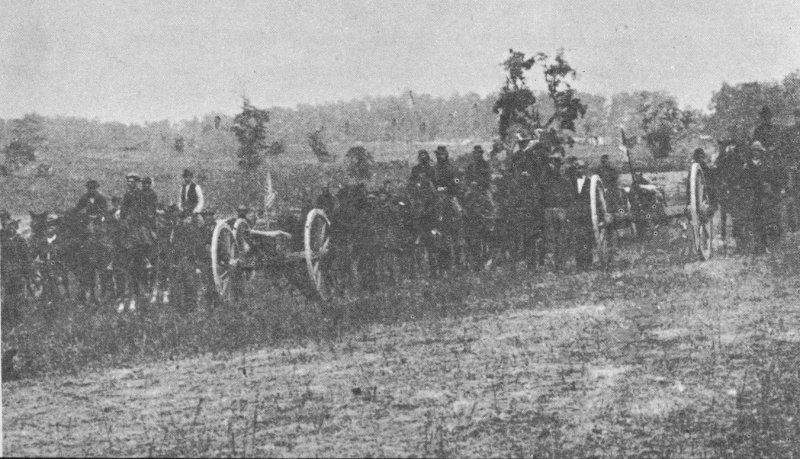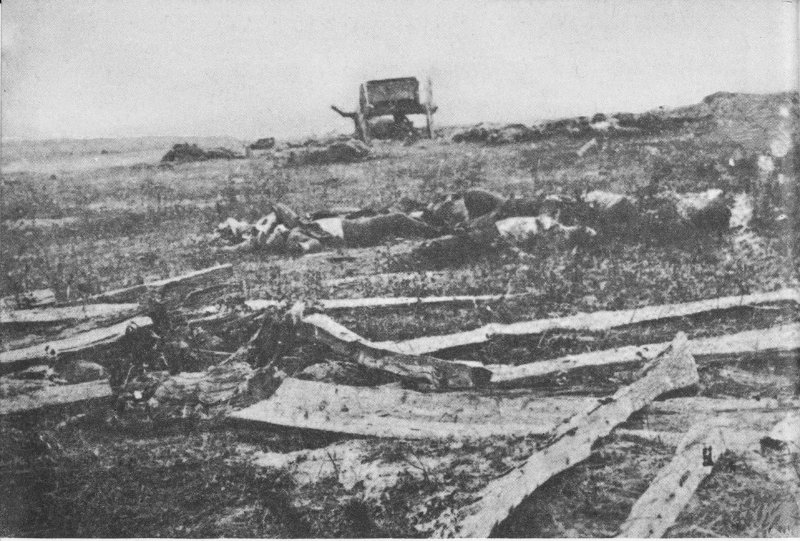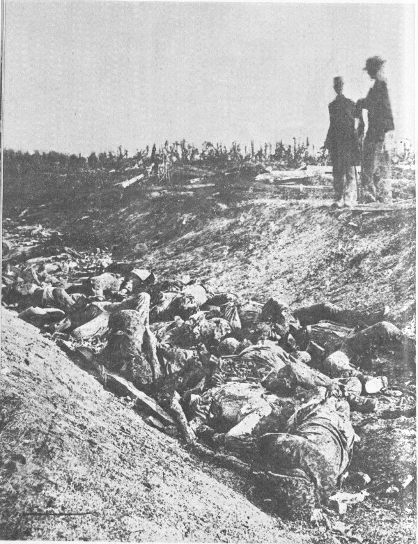 Focal point of the early morning attacks, the Dunker Church and some who defended it. From photograph attributed to James Gardner. Courtesy, Library of Congress.