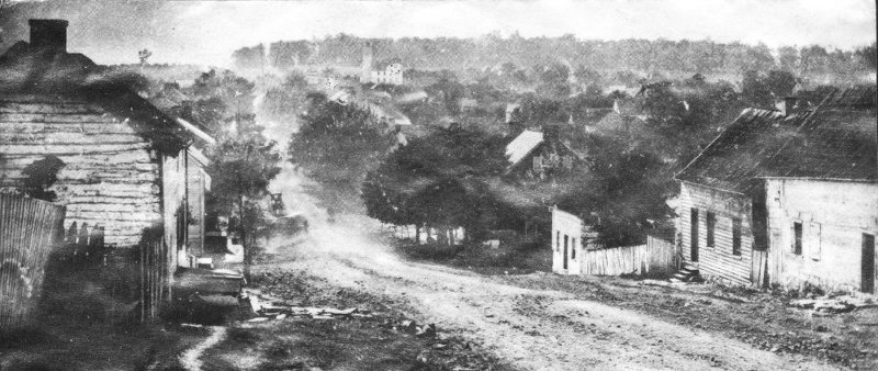 Sharpsburg shortly after the Battle of Antietam. Taken from crest of Sharpsburg Ridge, looking west down Boonsboro Pike toward Potomac River. Hagerstown Pike heads north (right) just beyond large tree in left-center. Lee’s headquarters were in Oak Grove in distance, just to right of Boonsboro Pike.