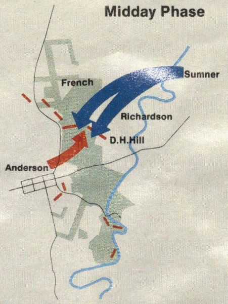 It was a good plan. If the Federal attacks could be delivered in concert, McClellan’s preponderance of power must stretch Lee’s smaller force to the breaking point. But the story of Antietam is one of piecemeal Federal attacks—a corps here, a division there. This failure in execution allowed Lee to shift troops from momentarily quiet sectors to plug the gaps torn by the succession of Federal attacks. As each threat developed, Lee rushed his troops there and beat it back. Taking advantage of his interior lines, he repeatedly 18 achieved a local advantage of numbers, though larger Federal contingents were always nearby.