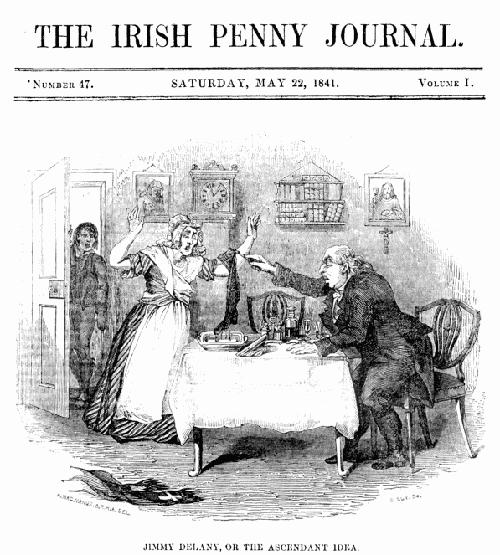“About five years come Michaelmas, I buried my old house-keeper Nell Gray—I was going to say with military honours, for she was quite a trooper of a woman—but with the honours due to a faithful deserving servant which she was, and a treasure in a family, especially for dressing beef-steaks. But as I saw even in her a good deal of the tricks of the sex (excuse me), I was determined to have no more womenkind about me. I therefore set about searching for a good, quiet lad, who would be tractable enough to learn to do all the ordinary work of the house; and my wishes being made known to my flock, boys of all ages and sizes soon clustered about me like sparrows round a wheat stack. Out of twenty-five ’cute-looking chaps, I chose our friend Jimmy Delany, to the rapturous delight of his mother, a widow, who, as she brought her precious son to me, with a shining Sunday face, and a clean shirt—or at least a collar—assured me that though ‘her Jimmy was the laist taste slow at takin’ up the larnin’, yit wanst he got a hoult ov it, it was he that would take the hoult in airnest!’