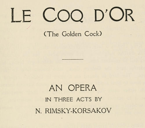 King Dodon, a lazy and gluttonous ruler, is greatly worried by his warlike neighbors. He seeks advice but his various advisers fail to comfort him. Finally the Astrologer brings him a wonderful bird, the Golden Cock, who knows how to foretell events. The bird is placed on a spire in Dodon’s capital and from hour to hour sends out from his high perch various messages which either send the crowd scurrying for their weapons, or cause it to scatter and return to its peaceful activities. The bird suddenly sounds a war alarm. Dodon assembles his warriors and they set out on their journey to the enemy’s land.