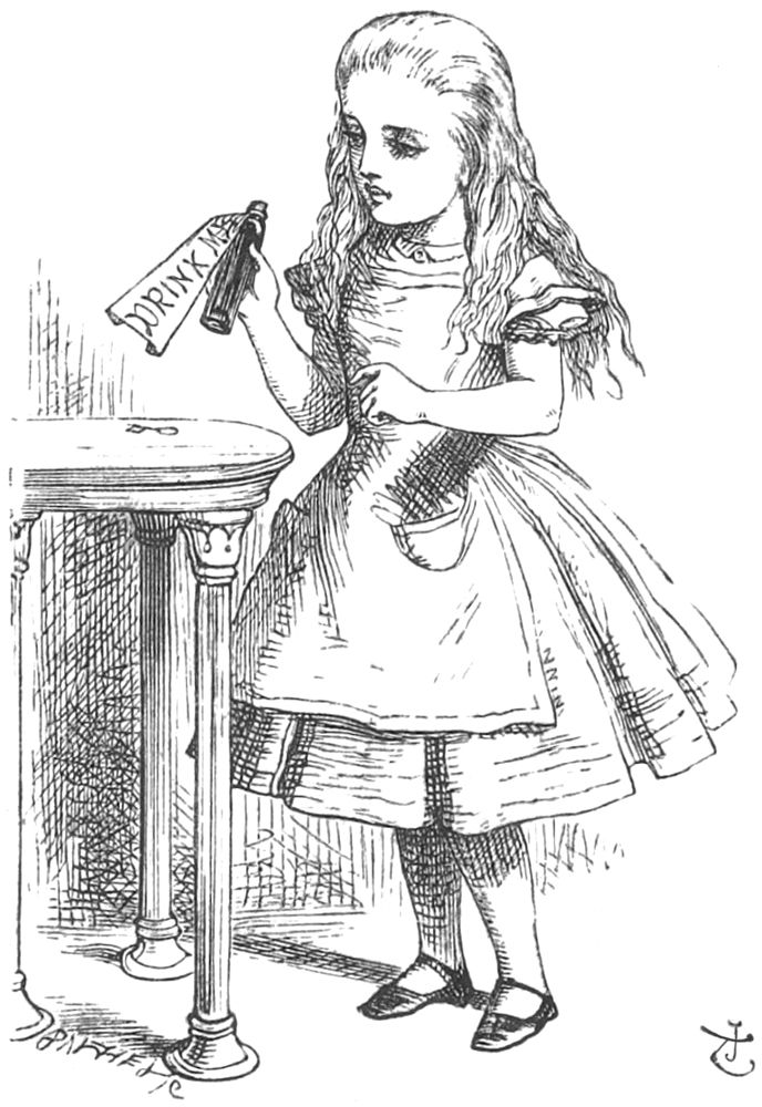Comme cela n’avançait à rien de passer son temps à attendre à la petite porte, elle retourna vers la table, espérant presque y trouver une autre clef, ou tout au moins quelque grimoire donnant les règles à suivre pour se fermer comme un télescope. Cette fois elle trouva sur la table une petite bouteille (qui certes n’était pas là tout à l’heure). Au cou de cette petite bouteille était attachée une étiquette en papier, avec ces mots “BUVEZ-MOI” admirablement imprimés en grosses lettres.