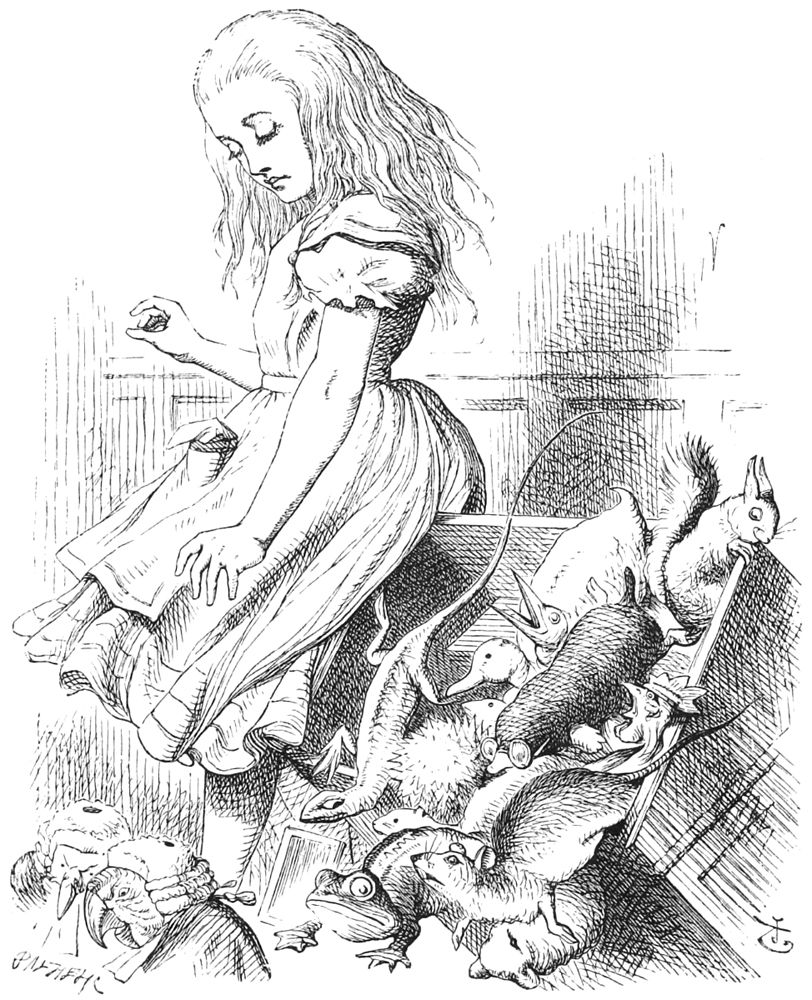 Il était grand temps de s’en aller, car la mare se couvrait d’oiseaux et de toutes sortes d’animaux qui y étaient tombés. Il y avait un canard, un dodo, un lory, un aiglon, et d’autres bêtes extraordinaires. Alice prit les devants, et toute la troupe nagea vers la rive.