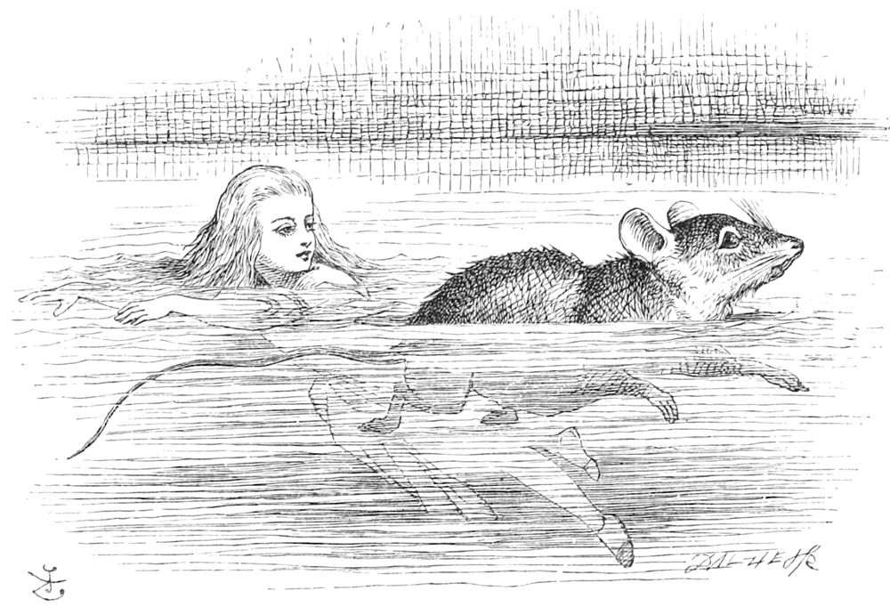 Au même instant elle entendit patauger dans la mare à quelques pas de là, et elle nagea de ce côté pour voir ce que c’était. Elle pensa d’abord que ce devait être un cheval marin ou hippopotame; puis elle se rappela combien elle était petite maintenant, et découvrit bientôt que c’était tout simplement une souris qui, comme elle, avait glissé dans la mare.