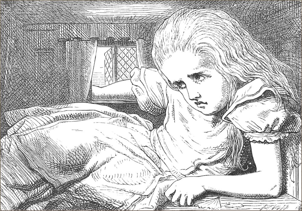 “Quelle honte!” dit Alice. “Une grande fille comme vous” (‘grande’ était bien le mot) “pleurer de la sorte! Allons, finissez, vous dis-je!” Mais elle continua de pleurer, versant des torrents de larmes, si bien qu’elle se vit à la fin entourée d’une grande mare, profonde d’environ quatre pouces et s’étendant jusqu’au milieu de la salle.