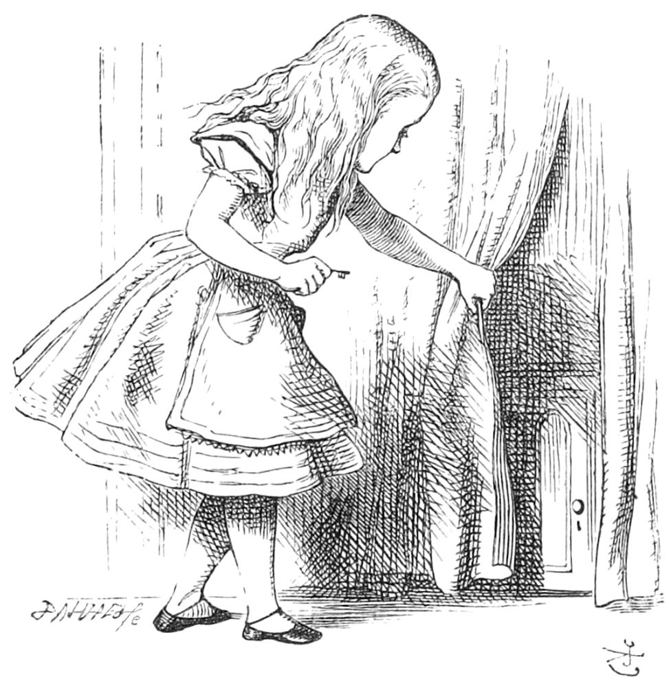 Il y avait des portes tout autour de la salle: ces portes étaient toutes fermées, et, après avoir vainement tenté d’ouvrir celles du côté droit, puis celles du côté gauche, Alice se promena tristement au beau milieu de cette salle, se demandant comment elle en sortirait.