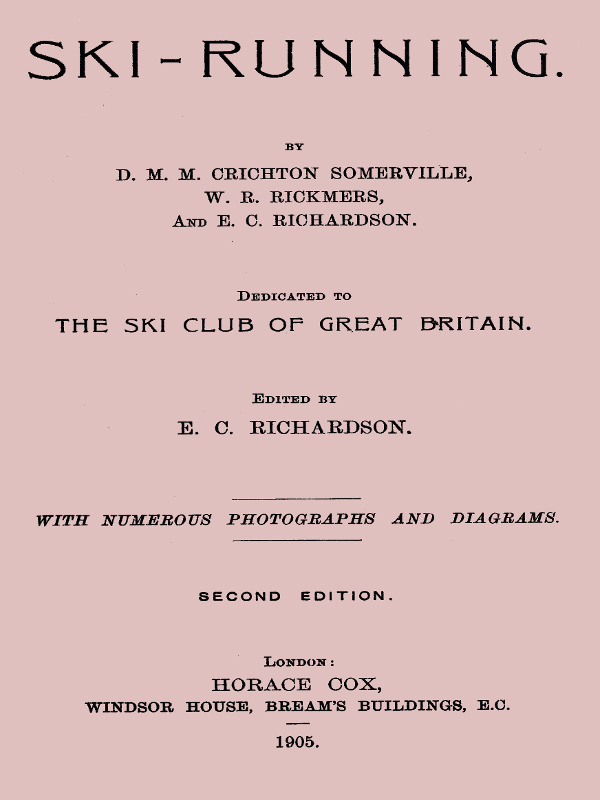 We are further greatly indebted to the many friends who have rendered us positive assistance. The frontispiece is from Herr Halström’s wonderful picture “Paa Skare,” which that gentleman has given us unqualified leave to reproduce. The ski-runner which it depicts also serves as a central figure for the cover, designed by Mr. Nico Jungman. To those who have iv kindly permitted us to copy their photographs we hereby take the opportunity of expressing our best thanks. The outline of the Solberg Hill is from an accurate drawing by Herr Von de Beauclair published in Ski, to the editor of which paper we are also indebted for the drawings illustrating Herr Sohm’s detachable seal’s-skin and climbing-irons. To Herr S. Höyer-Ellefsen, Herr Fredrik Juell, Herr Trygve Smith, Herr Durban Hansen, and numerous other skilful Norwegian runners we are grateful for many a useful hint and word of advice, whilst we owe to Herr Zdarsky a valuable practical demonstration of his methods of teaching. Messrs. C. W. Richardson, E. H. Wroughton, and H. P. Cox have been kind enough to help with the actual production of the little work, and if there be any others who we have omitted to mention we would hereby beg them to accept at once both our apologies and thanks.