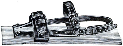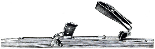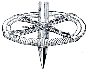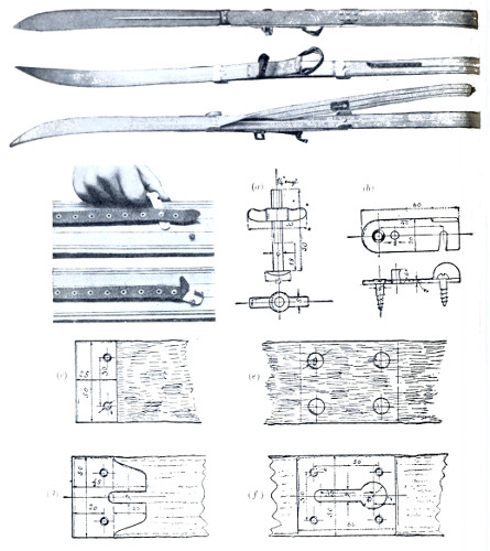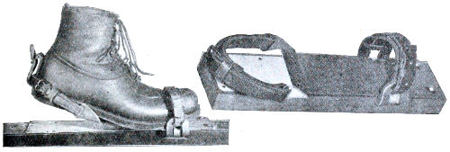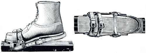 Of accessories to the ski, the staff has invariably been recognised as a necessity (except in leaping competitions, when it becomes a source of the greatest danger) and should always form part of the outfit on all long excursions or journeys. It assists the skier both in aiding him when ascending, and as a brake when descending difficult slopes, or as a means of defence if attacked by animals. The Lapps use it, too, as an offensive weapon when attacking wolves, which they occasionally run down on their ski, and kill by a well-directed blow on the snout, or across that most vulnerable spot, the loins of the beast. The most effectual use of the staff can only be learnt by experience or teaching. The fastenings may be regarded as other important accessories, and but a few years ago, and in many parts even still consist solely of toe straps formed of withes or leather. These simple contrivances suited all the requirements of the expert peasants, and it is only of late years, when leaping was introduced, and the ski put to other and harder purposes than originally intended, that stronger and more secure bindings became necessary. Of these, there are many sorts, all good, but none perfect as yet. In some instances the latter may be a source of great danger owing to its being impossible, when peril faces one, or accidents occur, to remove the ski from the feet, and notably so when a man breaks through treacherous snow-covered ice, owing to the ski preventing him from regaining the surface. But while several fatal accidents have occurred in this manner, it is possible that others have been avoided by the greater command of the ski afforded to most people by secure fastenings.