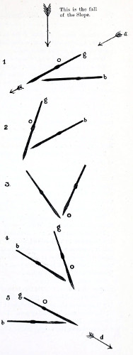 There can be little doubt but that the greatest development of the ski has taken place in Europe, notably in Scandinavia, where they have been modified to suit the different requirements of the districts in which they are employed. Thus have the varied types hitherto been many, but may be divided generally into two groups, viz., the short and broad, or loose snow ski, and the long and narrow, or compact snow variety (“skare ski”), this latter pattern being represented by the Oesterdal and Swedish ski (originally one very long and one short ski, but now generally of equal length). These are the most suitable for open country, whether in the lowlands or mountains, and on level or undulating land are superior, so far as speed is concerned, to all others; but in broken country, or on mountains where obstacles such as trees, rocks, &c., are to be met with, the shorter or “loose snow” patterns, owing to their handiness, are invariably employed. 8