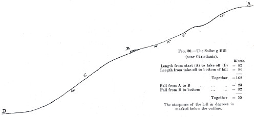 Having now given an outline of the history and origin of the ski, it may be well to refer to the movement by which ski-ing has been brought into the prominent notice of sportsmen and admirers of winter pastimes. In the extensive and mountainous district of Telemarken, Norway, one in which ski were employed possibly more extensively than in any other, owing to its remoteness, and the wretched state of the few highways and byways to be found there, the peasants discovered that the ski might be used for pleasure as well as ordinary pursuits, and arranged meetings at which races were run, and the leaping powers of competitors tested on the slopes of selected hills. By degrees news of these trials of skill found its way to the towns and the populated districts in their neighbourhood, and some few citizens having found ski-ing to be a good, and to them attractive, exercise, determined to hold similar meetings at Christiania each winter. The accounts given of those meetings are very ludicrous, the hill being neither steep nor long, the competitors riding astride their poles down the track, and only jumping, if jumping it could be called, a few yards. The exhibitions did not “catch on,” and were discontinued for many years. The townsfolk knew too little about the sport to appreciate it, and the absurd, if not painful, appearance of the competitors was not encouraging to aspirants. Towards the end of the seventies, however, owing chiefly to the exertions of the Christiania Ski Club—a select institution with but few members—some Telemarken peasants4 were induced to visit the capital, and in the early part of 1879 a ski meeting was held on the slopes of the hill at Huseby, near Christiania, which was attended by a couple of the countrymen, who took part, together with other competitors, in the races and leaping that had been arranged. The Huseby slope was one which, only a few years previously, had been described as highly dangerous, and impossible to descend when the snow was fast and in good condition.