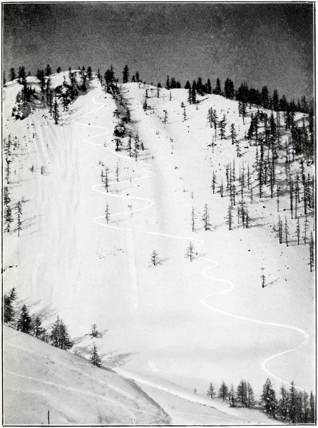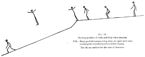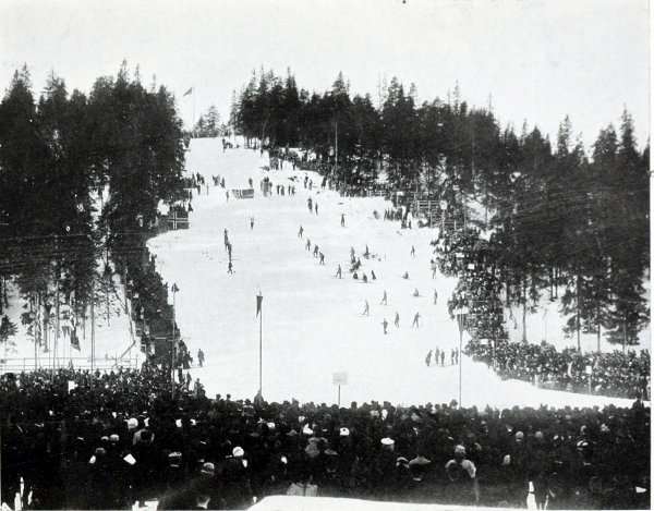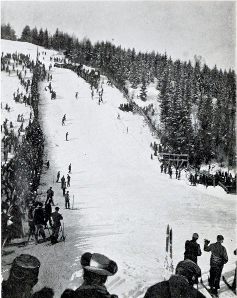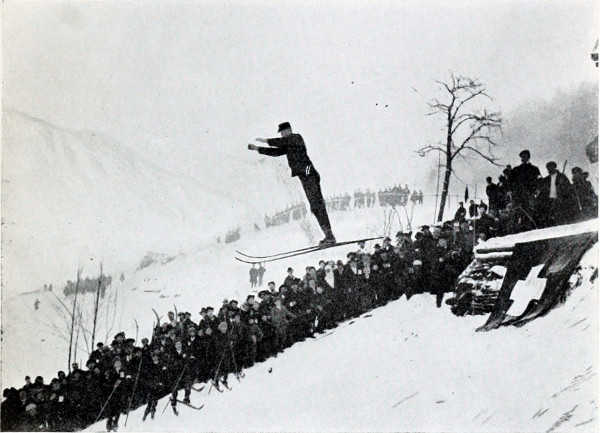 The leaping competition proved most highly interesting. 10 though in some respects quite comical. Every man, except the Telemarkings, carried a long, stout staff, and on that, so they thought, their lives depended. Starting from the summit, riding their poles, as in former times, like witches on broom-sticks, checking the speed with frantic efforts, they slid downwards to the dreaded platform or “hop” from which they were supposed to leap, but over which they but trickled, as it were, and, landing softly beneath, finally reached the bottom somehow, thankful for their safe escape from the dreaded slide. But then came the Telemark boys, erect at starting, pliant, confident, without anything but a fir branch in their hands, swooping downwards with ever-increasing impetus until with a bound they were in the air, and 76ft. of space was cleared ere, with a resounding smack, their ski touched the slippery slope beneath, and they shot onwards to the plain, where suddenly they turned, stopped in a smother of snow dust, and faced the hill they had just descended! That was a sight worth seeing, and one never to be forgotten, even if in after years such performances have been, in a way, totally eclipsed.