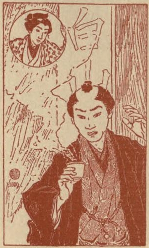 On the fourth day of the first month of the third Tenwa,—that is to say, about two hundred and twenty years ago,—the lord Nakagawa Sado, while on his way to make a New Year's visit, halted with his train at a tea-house in Hakusan, in the Hongō district of Yedo. While the party were resting there, one of the lord's attendants,—a wakatō[1] named Sekinai,—feeling very thirsty, filled for himself a large water-cup with tea. He was raising the cup to his lips when he suddenly perceived, in the transparent yellow infusion, the image or reflection of a face that was not his own. Startled, he looked around, but could see no one near him. The face in the tea appeared, from the coiffure, to be the face of a young samurai: it was strangely distinct, and very handsome,—delicate as the face of a girl. And it seemed the reflection of a living face; for the eyes and the lips were moving. Bewildered by this mysterious apparition, Sekinai threw away the tea, and carefully examined the cup. It proved to be a very cheap water-cup, with no artistic devices of any sort. He found and filled another cup; and again the face appeared in the tea. He then ordered fresh tea, and refilled the cup; and once more the strange face appeared,—this time with a mocking smile. But Sekinai did not allow himself to be frightened. "Whoever you are," he muttered, "you shall delude me no further!"—then he swallowed the tea, face and all, and went his way, wondering whether he had swallowed a ghost.