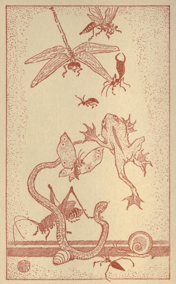 Supposing, however, that the order of the universe were really as Buddhists believe, and that I knew myself foredoomed, by reason of stupidities in this existence, to live hereafter the life of an insect, I am not sure that the prospect would frighten me. There are insects of which it is difficult to think with equanimity; but the state of an independent, highly organized, respectable insect could not be so very bad. I should even look forward, with some pleasurable curiosity, to any chance of viewing the world through the marvellous compound eyes of a beetle, an ephemera, or a dragon-fly. As an ephemera, indeed, I might enjoy the possession of three different kinds of eyes, and the power to see colours now totally unimaginable. Estimated in degrees of human time, my life would be short,—a single summer day would include the best part of it; but to ephemeral consciousness a few minutes would appear a season; and my one day of winged existence—barring possible mishaps—would be one unwearied joy of dancing in golden air. And I could feel in my winged state neither hunger nor thirst,—having no real mouth or stomach: I should be, in very truth, a Wind-eater. ... Nor should I fear to enter upon the much less ethereal condition of a dragon-fly. I should then have to bear carnivorous hunger, and to hunt a great deal; but even dragon-flies, after the fierce joy of the chase, can indulge themselves in solitary meditation. Besides, what wings would then be mine!—and what eyes!... I could pleasurably anticipate even the certainty of becoming an Amembō,[4] and so being able to run and to slide upon water—though children might catch me, and bite off my long fine legs. But I think that I should better enjoy the existence of a sémi,—a large and lazy cicada, basking on wind-rocked trees, sipping only dew, and singing from dawn till dusk.