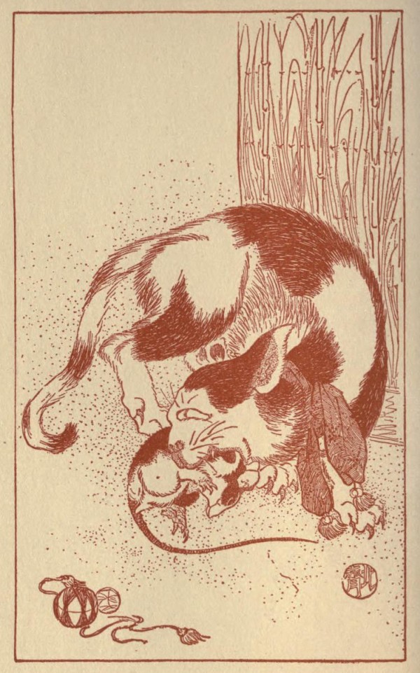 The first time that she had kittens, she proved herself an excellent mother,—devoting all her strength and intelligence to the care of her little ones, until, by dint of nursing them and moiling for them, she became piteously and ludicrously thin. She taught them how to keep clean,—how to play and jump and wrestle,—how to hunt. At first, of course, she gave them only her long tail to play with; but later she found them other toys. She brought them not only rats and mice, but also frogs, lizards, a bat, and one day a small lamprey, which she must have managed to catch in a neighbouring rice-field. After dark I used to leave open for her a small window at the head of the stairs leading to my study,—in order that she might go out to hunt by way of the kitchen roof. And one night she brought in, through that window, a big straw sandal for her kittens to play with. She found it in the field; and she must have carried it over a wooden fence ten feet high, up the house wall to the roof of the kitchen, and thence through the bars of the little window to the stairway. There she and her kittens played boisterously with it till morning; and they dirtied the stairway, for that sandal was muddy. Never was cat more fortunate in her first maternal experience than Tama.