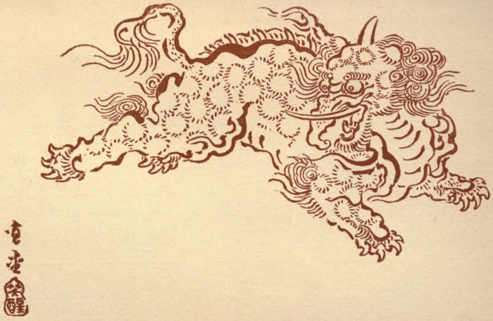 The name of the creature is Baku, or Shirokinakatsukami; and its particular function is the eating of Dreams. It is variously represented and described. An ancient book in my possession states that the male Baku has the body of a horse, the face of a lion, the trunk and tusks of an elephant, the forelock of a rhinoceros, the tail of a cow, and the feet of a tiger. The female Baku is said to differ greatly in shape from the male; but the difference is not clearly set forth. In the time of the old Chinese learning, pictures of the Baku used to be hung up in Japanese houses, such pictures being supposed to exert the same beneficent power as the creature itself. My ancient book contains this legend about the custom:—