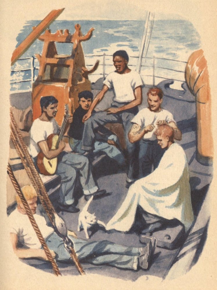 The barber is a man from the black gang. That means he works in the engine room. When he is off watch, he likes to make a little extra money cutting hair. So he puts a sheet around Jim and starts to work. Chiquita, the ship’s cat, takes a playful swipe at a dangling corner of the sheet, and then goes off in search of a rat that may have come aboard in port.{23}