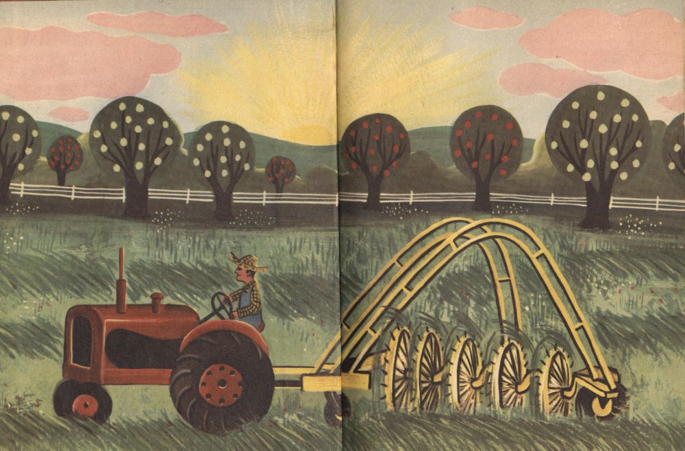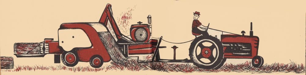 After the mowing machine has cut the hay, Al pulls his automatic baler across the field. The baler scoops the hay up, then presses it into a box-shaped bundle,{27} slices it off neat and square, and ties it with strong twine. One by one the bales drop out on the field, ready for a truck to pick them up.