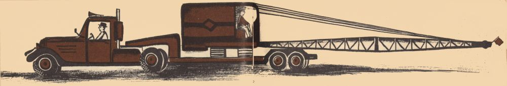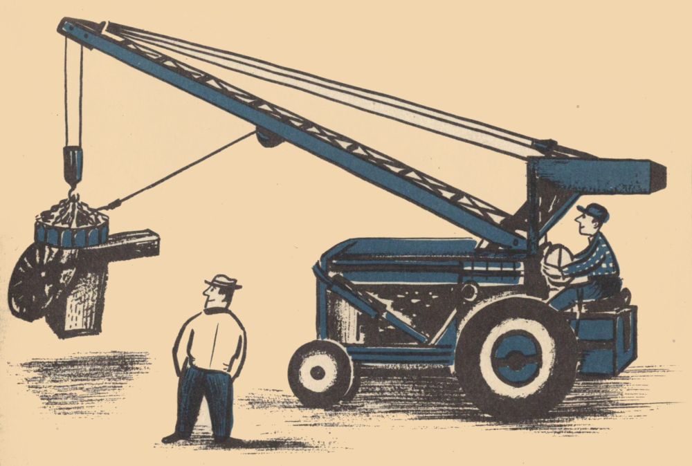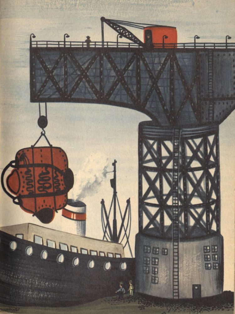 Often the crane hoists big boilers out of ships so that repair men can work on them. It is so huge that it carries another crane on its back. The piggy-back crane—that’s its real name—reaches down and lifts things off the deck of the ship, too.