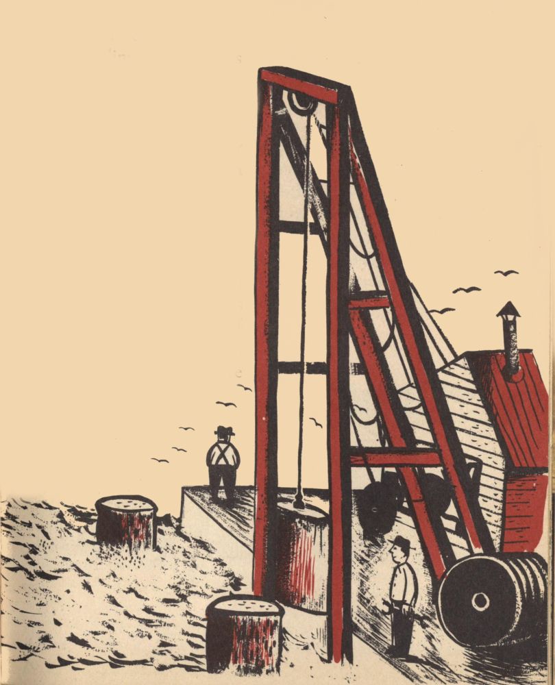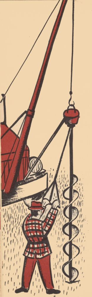 An even bigger pounding machine is the pile driver. It can hammer a great thick log down into the ground almost as easily as a man can hammer a nail through a board. One kind of pile driver does its pounding job with a steam piston. Another kind lifts a heavy weight and lets it bang down on top of the log, called a pile. The one in the picture{14} works in a harbor. It drives piles deep into the earth that lies under water. A whole group of piles make the foundation for a pier in the harbor, for ships to tie up alongside.