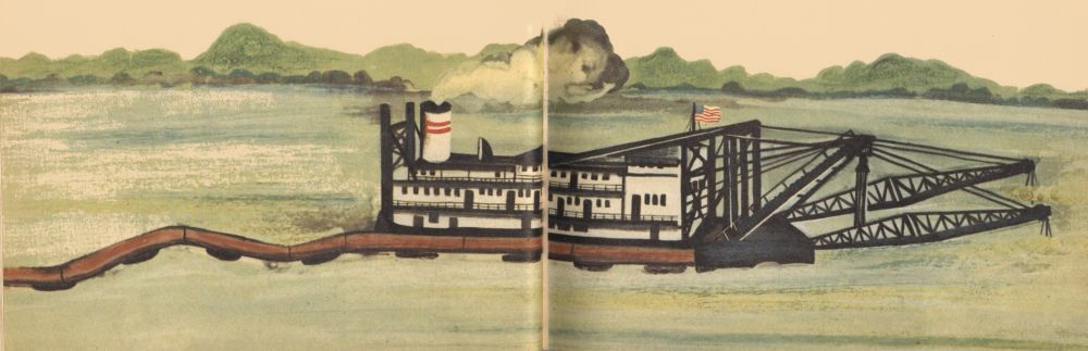 If there’s hard-caked mud on the bottom, cutter heads break it up. Then it’s ready to be pumped out through huge steel pipes that stretch away from the dredge like a great snake and pour the spoil out on land.