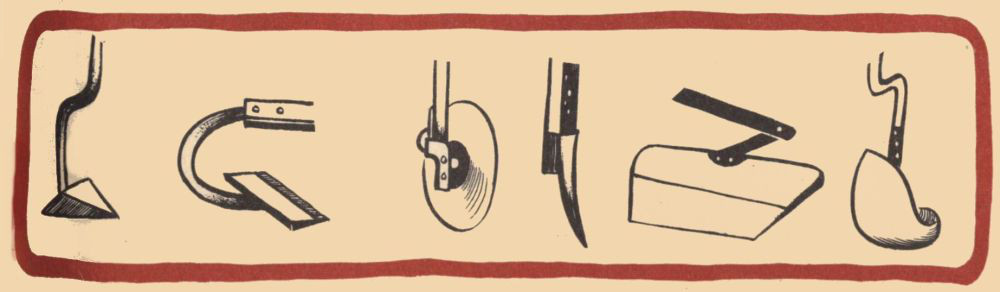 After the corn is well up, Dan pulls the cultivator through the field, driving carefully, with the wheels between the rows. Small blades on the cultivator cut through the weeds and break the soil into loose chunks. The pictures show several kinds of cultivator blades.
