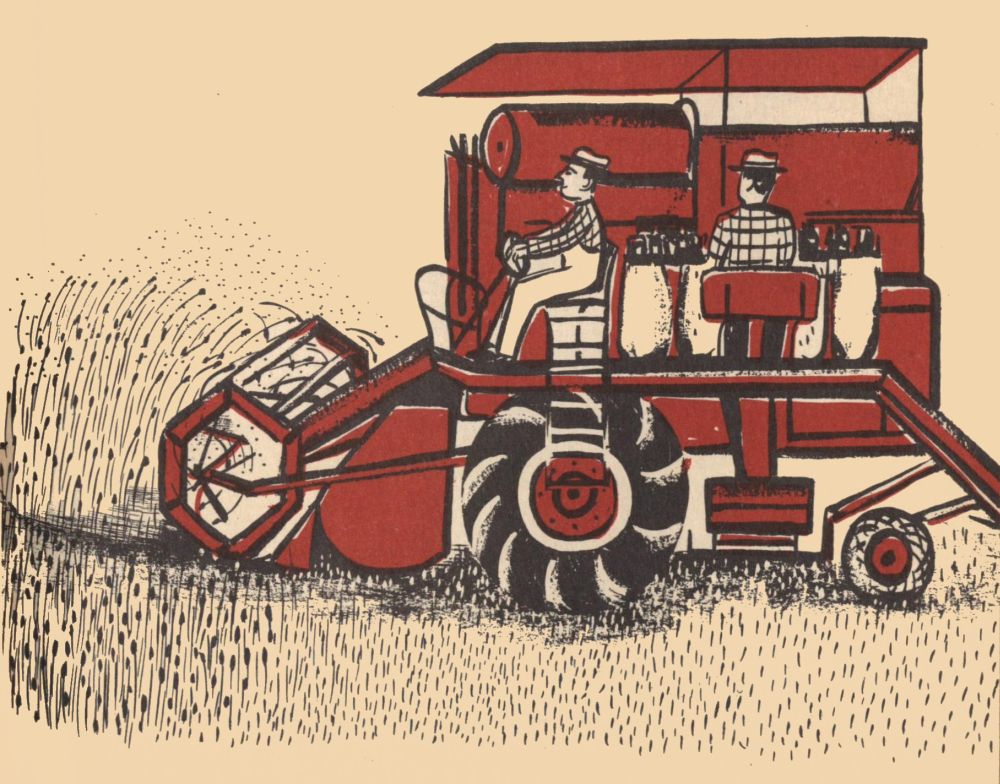 Dan’s farm is small, so he can’t afford to buy a big corn-picking machine. But his neighbor Al has one that he rents out, and one morning Dan drives it to his{22} cornfield. His tractor seems lost inside the picking machine. Gatherers that look like the pointed snouts of huge mice creep along in front of the tractor close to the ground. One by one the stalks of corn go into the machine, which snaps the ears off. Then revolving claws and rubber paddles rip off the husks, and an elevator carries the clean ears back to a wagon which the tractor pulls along. In a very short time, Dan’s whole field is done.