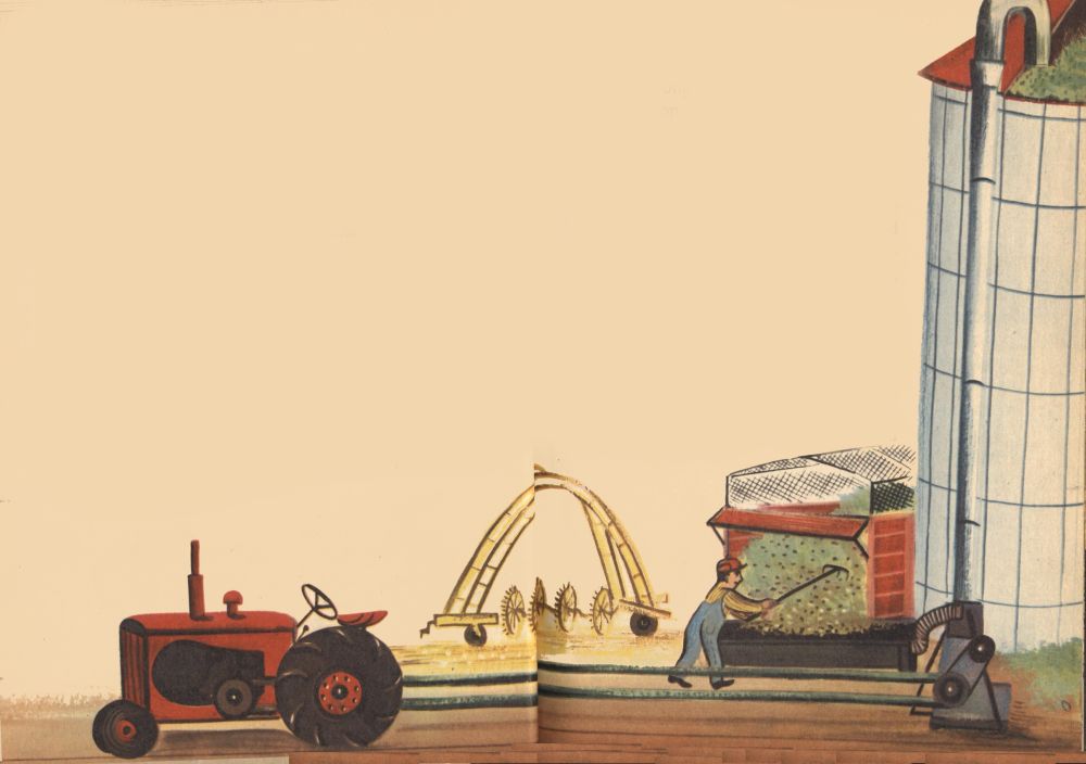 Dan’s neighbor Al has a big dairy farm, with lots of cows to milk every day, and land enough to grow their feed. Besides his corn picker, Al has other special machines. One of them cuts corn while it is still green, chops it up fine and loads it into a truck. The truck has a sort of cage over it to keep the corn from spilling out. Next, Al turns his tractor into a stationary engine which{26} runs a blowing machine. A wide belt from a pulley on the tractor turns the blower, which shoots the chopped-up corn to the top of a storage tower called a silo. The green stuff ferments in the silo and turns into wonderful food for the cows.
