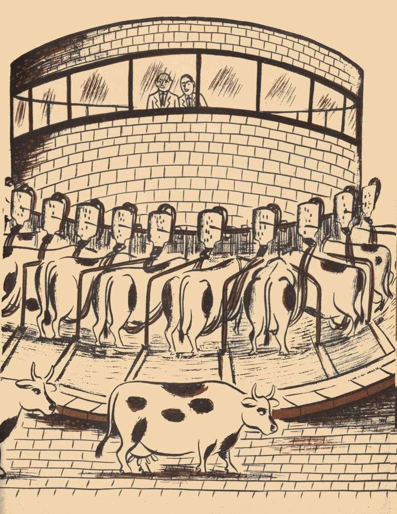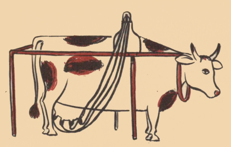 You’d never guess it, but a cow is a nervous, fussy animal. She lets down her milk easily if the same person{30} or the same machine squeezes on her teats with the same rhythm every day, but any kind of change or hurry upsets her. Then she’s hard to milk. And so Al’s machine is built with a very accurate timer which makes the funnels squeeze exactly forty-eight times a minute.
