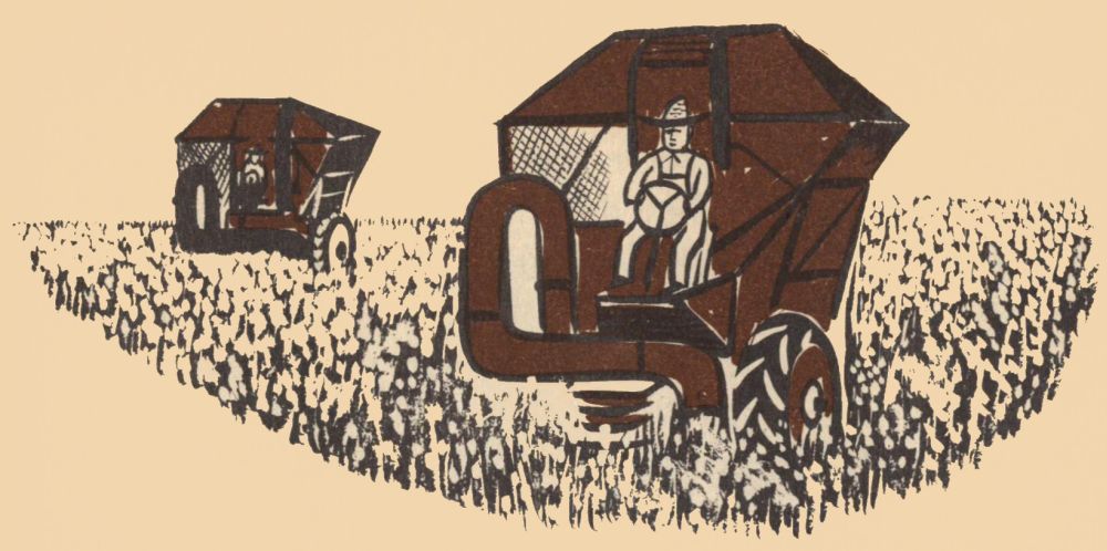 Cotton is a crop that has always taken an enormous amount of work. Even after cultivating machines were invented, men had to go through the fields twice every year and hoe out weeds around the plants by hand. One farmer rigged up a contraption that made hoeing{37} easier. He hitched an air compressor to his tractor and ran hoses from the compressor to four special hoes. Then the escaping air jiggled the hoes in the men’s hands and saved the work of swinging them up and down.