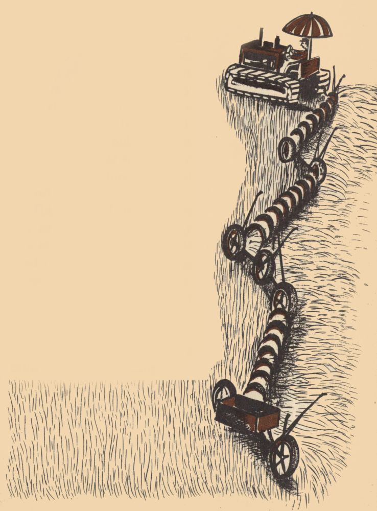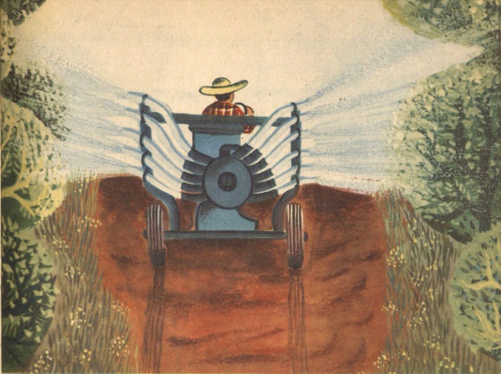 Texan, with a bigger field and more machines, had a larger idea. He set three tractors loose without drivers, one behind the other. Away they went, round and round. If one traveled too fast and caught up with the{36} one ahead, they stopped. The only work he had to do was go out and start them up again!