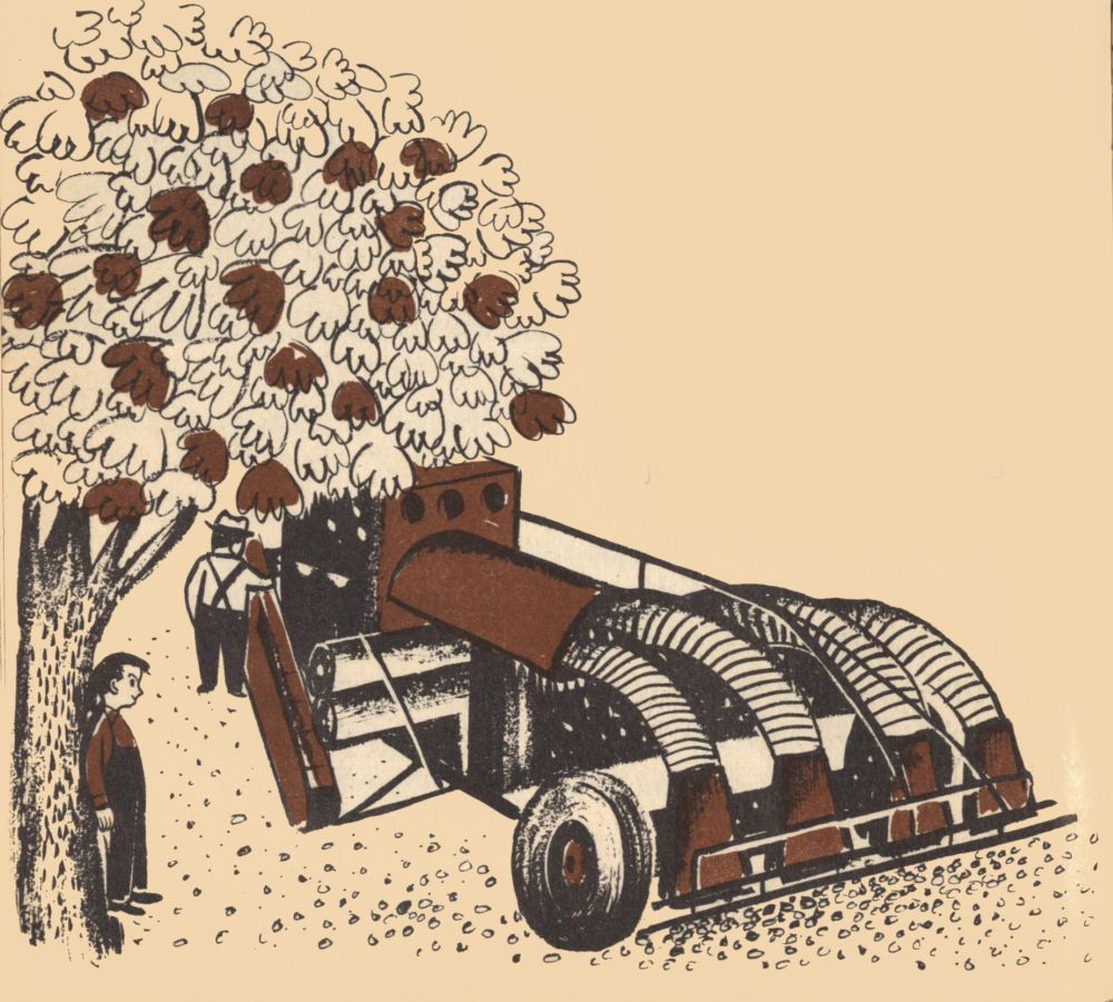One clever contraption attached to a tractor grabs hold of nut trees and gives them a hard shaking. The nuts fall on the ground, ready for a kind of giant vacuum sweeper to come and suck them into a truck.{42}