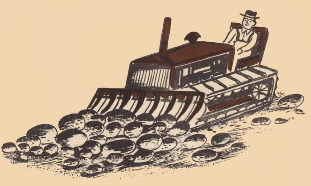 Crops that grow underneath the earth need their own sort of harvesting machine. There are potato diggers and many others. The sugar beet digger works in a particularly clever way. Machine fingers feel for the beet tops. They set off a knife which cuts the tops off while other fingers lift the beet out and put it on an elevator which removes the clods of dirt as it travels. Once in a while the machine makes a mistake and delivers a stone, or a chunk of mud at the end of the elevator. Men do nothing but throw the junk away and let the beets slide into the truck that travels alongside.