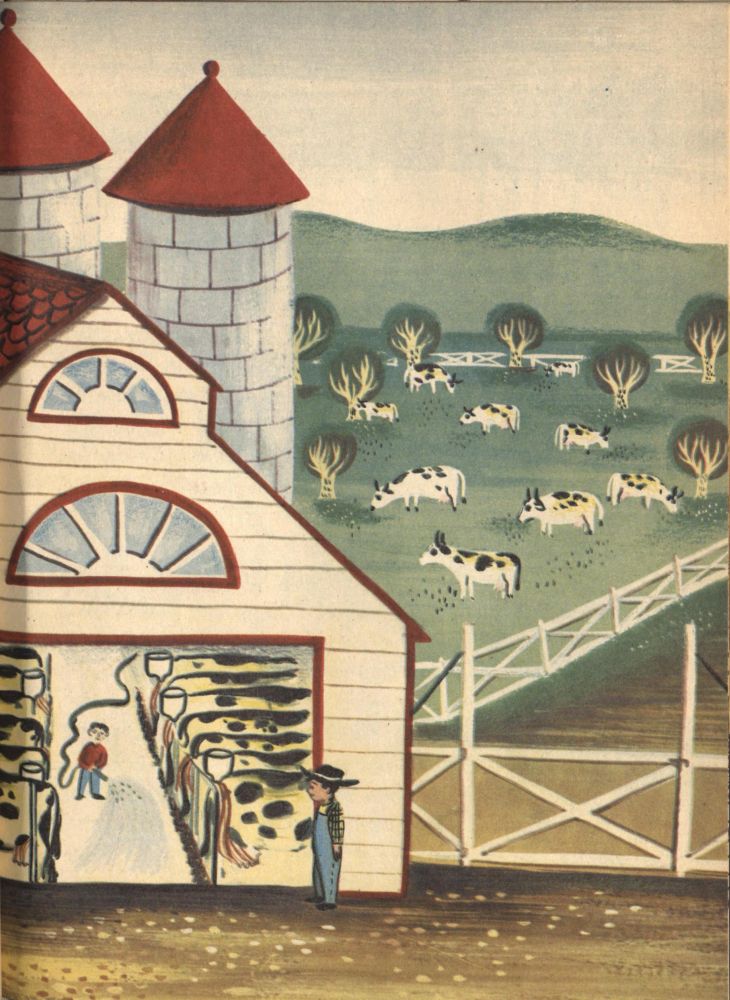 A good farmer tries to make life calm and comfortable for his cows. Even the names for some things in Al’s barn have a comfortable sound. The place where the cows wait to be milked is called the loafing pen. The room where they stand for milking is kept perfectly clean, and it’s called the milking parlor.