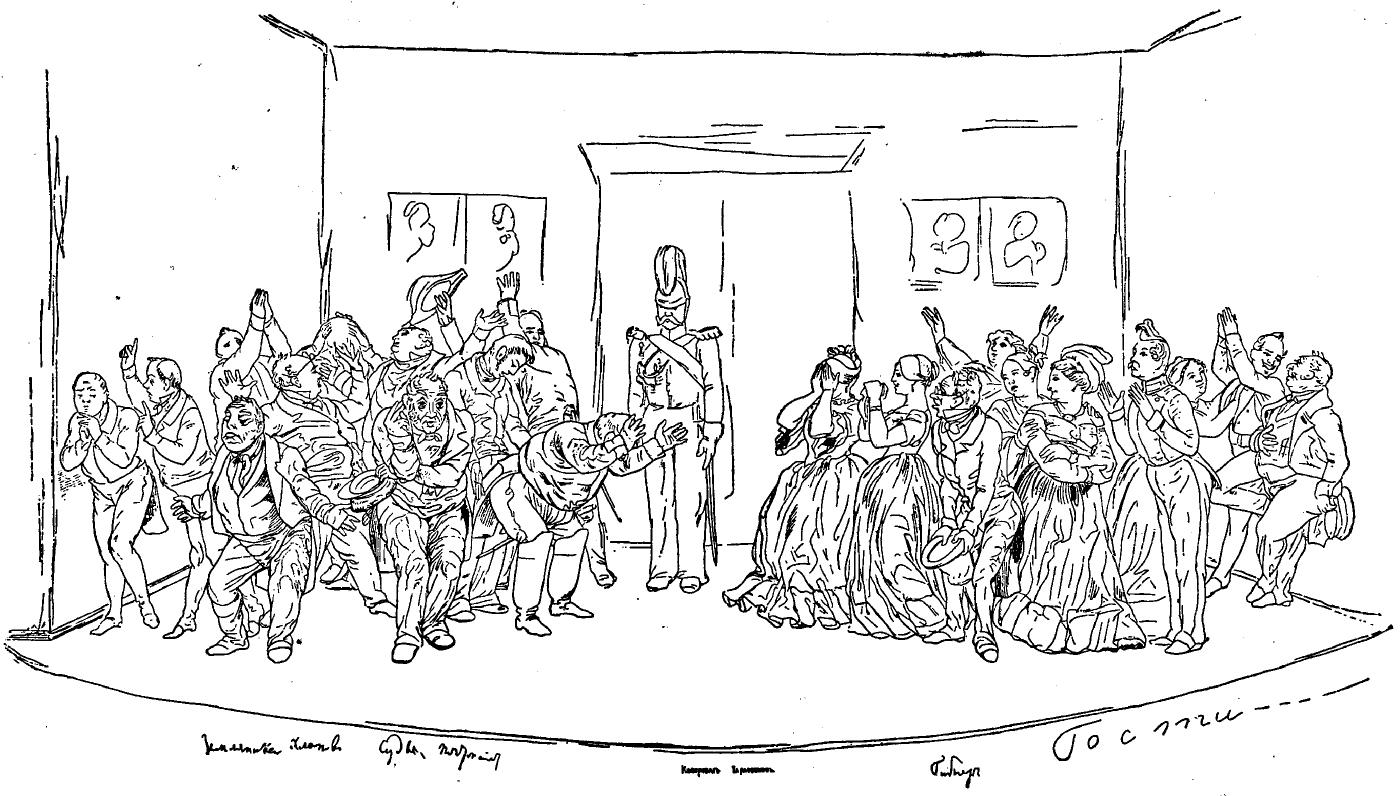 Die Herren Schauspieler sollten der letzten Szene besondere Sorgfalt angedeihen lassen. Das zuletzt ausgesprochene Wort muß auf alle wie ein elektrischer Schlag wirken; gleichzeitig und plötzlich. Die ganze Gruppe muß ihre Stellung in einem Augenblick wechseln; den Ausruf der Überraschung müssen alle Damen einstimmig ausstoßen, wie aus einem Munde. Die Nichtbeachtung dieser Hinweise könnte die gesamte Wirkung in Frage stellen.