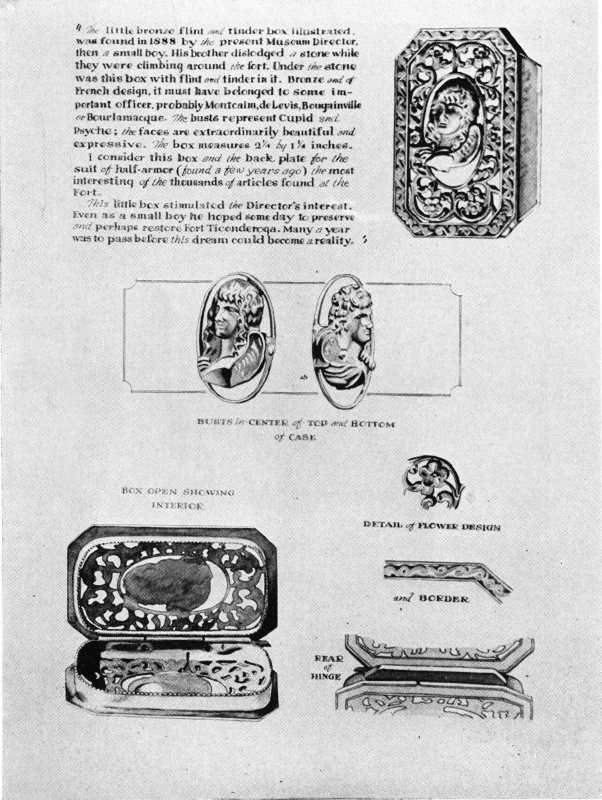 “The little bronze flint and tinder box illustrated, was found in 1888 by the present Museum Director, then a small boy. His brother dislodged a stone while they were climbing around the fort. Under the stone was this box with flint and tinder in it. Bronze and of French design, it must have belonged to some important officer, probably Montcalm de Levis, Bougainville or Bourlamacque. The busts represent Cupid and Psyche; the faces are extraordinarily beautiful and expressive. The box measures 2¼ by 1¼ inches.