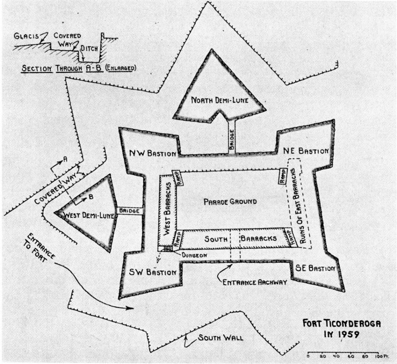 “I found on my arrival at St. Frederic an intrenchment begun on wrong principles which I felt obliged to continue to be agreeable to the Commandant of the Army who feared the enemy might at any moment attack the Fort. At last, on the 12th October, on the order of M. le Marquis de Vaudreuil, these works ceased and we moved the camp from St. Frederic to Carillon to begin a Fort at the location which I should find to be most suitable for such purpose.