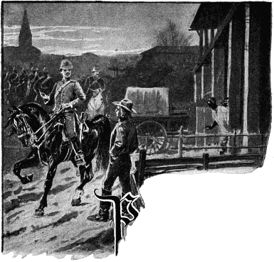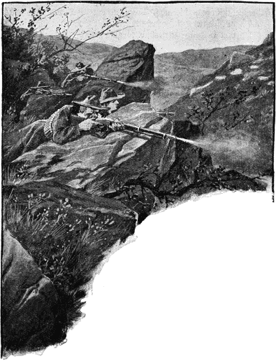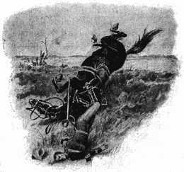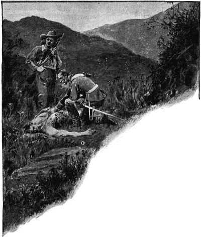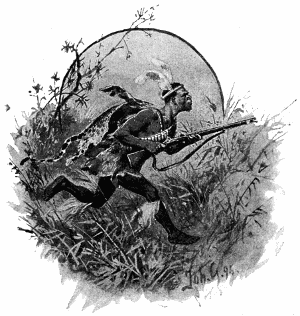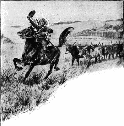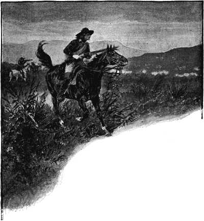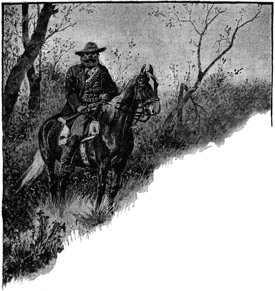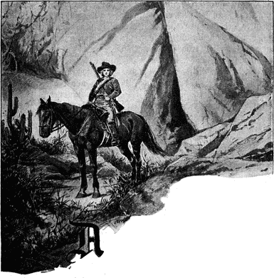 Der Reiter war von gewaltigem Wuchse, breit von Brust und Schultern und mit langen Beinen. Er hatte ein kriegerisches Aussehen, obwohl keine Abzeichen militärischer Art seinen Anzug als den eines Soldaten kenntlich machten. Sein Gesicht war von Wind und Wetter gebräunt, ein Hut mit sehr breitem Rande bedeckte[S. 2] sein Haupt, über der dunkelgrauen Bluse trug er einen Gurt von Büffelleder, an welchem ein Hirschfänger herabhing; über die eine Schulter gehängt war ein breiter Lederriemen, der der ganzen Länge nach mit metallenen Patronen besteckt war, und über der anderen Schulter trug er eine Büchse. Seine Füße steckten in hohen, bis zum Knie reichenden Stiefeln mit schweren Sporen.